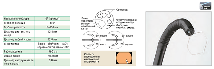 Устройство имеет расширенный инструментальный канал для полного спектра эндоскопических инструментов, систему смыва WaterJet для очистки исследуемой поверхности. Чёткое видеоизображение и манёвренность дистального конца до 180° в направлении вниз/вверх позволяют быстро определить источник беспокойства и осуществить необходимые лечебные манипуляции.