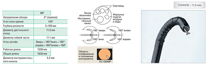 Видеоколоноскоп EC-530MP с рабочей длинной в 1330 мм оснащён тонким вводимым концом толщиной 11.0 мм, благодаря чему может применяться в том числе и в педиатрии. Эндоскоп отличается удобным введением и отличной маневренностью. Модель имеет канал для инструментов диаметром 3.2 мм, форсунки для подачи воздуха и воды, большие углы изгиба.