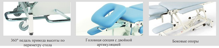 Широкий ассортимент дополнительных аксессуаров поможет приспособить выбранную модель к индивидуальным требованиям заказчика. Массажный стол может быть оптимизирован за счёт колёс с центральной блокировкой, боковых опор, педалей для регулировки высоты, головной секции с артикуляцией, пультов управления, держателей и автоматического выключателя.