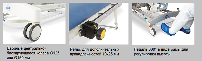 Ножная педаль в виде рамы для электрического регулирования уровня высоты, пульт управления (ручной), центрально-блокирующиеся двойные колёса, колесо направляющее, ложе из 2-х секций, электрически управляемая спинная секция, рельс для крепления дополнительных аксессуаров, зажим, держатель для одноразовых простыней. |