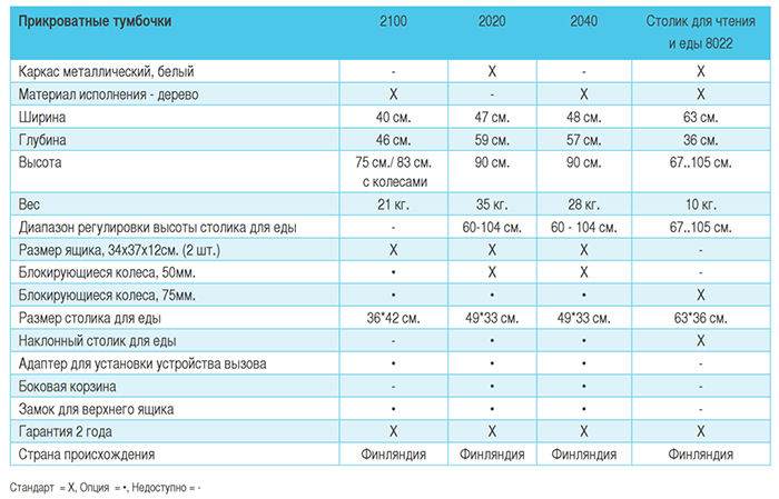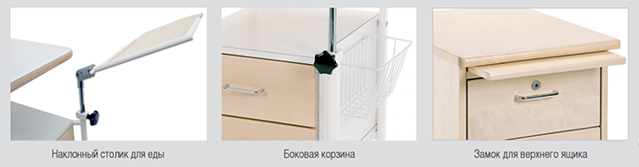 Дополнительно к прикроватной тумбочке можно приобрести наклонный стол для еды, корзину бокового крепления, замочек для ящика.