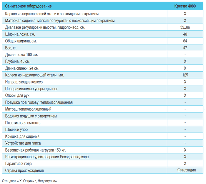 Санитарное кресло может быть доукомплектовано водяной подушкой для душевой процедуры, туалетным ведром с держателем, опорой для затылка, крышкой к сиденью кресла, комплектом опор под гипс.