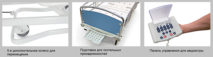 Производитель предлагает большой выбор дополнительных принадлежностей для кровати. Опционально заказчик может приобрести дугу для активации, ручной упор, держатель для мочеприемника, подставки для постельного белья и монитора, панель управления функциями кровати, столик для еды.