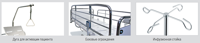 Опционально модели серии Salli могут быть усовершенствованы за счёт функции Тренделенбург/Анти-Тренделенбург, инфузионных изогнутых и прямых стоек, дуги («гусь») для активации пациентов, упоров. Дополнительно кровати могут быть оборудованы пятым колесом для облегчённого маневрирования, боковыми крашеными или хромированными ограждениями.